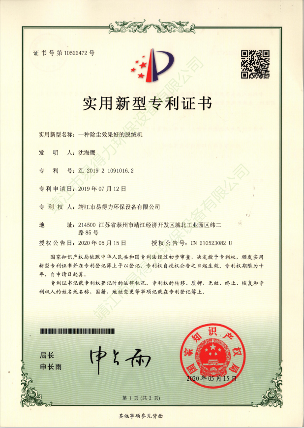 專(zhuān)利證書(shū)本公司坐落于開(kāi)放開(kāi)發(fā)超前城市江蘇靖江,我們精良優(yōu)秀設(shè)計(jì)團(tuán)隊(duì)始終遵循著創(chuàng)新超越的理念,贏得了中外合資企業(yè)的信賴(lài)。易得力環(huán)保設(shè)備有限公司與上海環(huán)科院等科研單位保持合作關(guān)系,不斷加大自身的科研力量,集中了一批國(guó)內(nèi)環(huán)境科技研究和應(yīng)用方面的高素質(zhì)人才,取得多項(xiàng)實(shí)用新型專(zhuān)利證書(shū)。…… 查看更多 >>